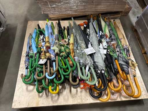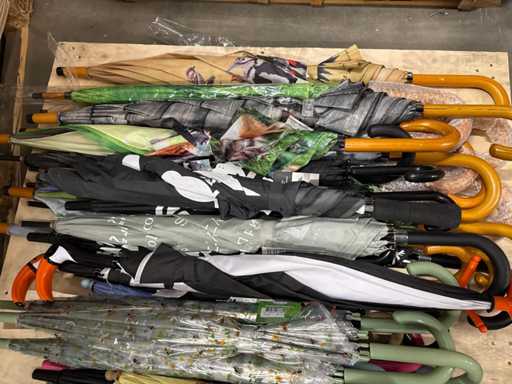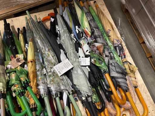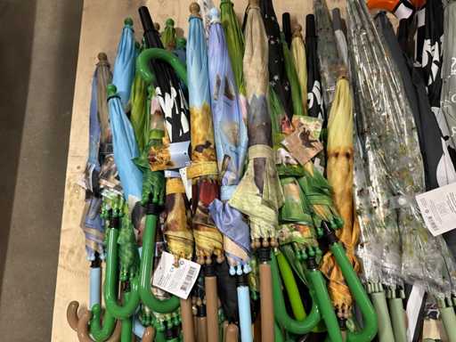 Duża partia 100 nowych parasoli, mieszanka modeli dla dorosłych i dzieci. Parasole mają różne kolory, wzory i uchwyty, idealne do wyprzedaży, rozdawania lub zapasów sklepowych. Wszystkie parasole są nowe i nieużywane. Różnorodna i atrakcyjna mieszanka, gdzie zawsze jest coś pomiędzy. Idealne dla traderów lub organizacji.