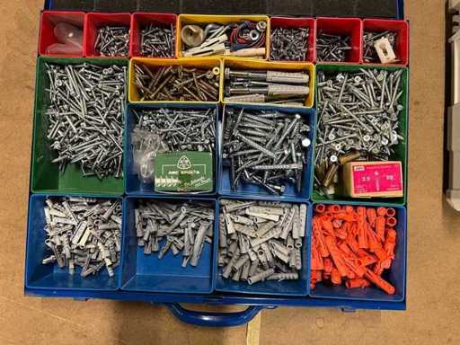Partia śrub i kołków (ok. 1000) w metalowym pudełku na asortyment