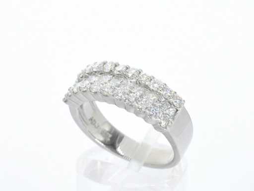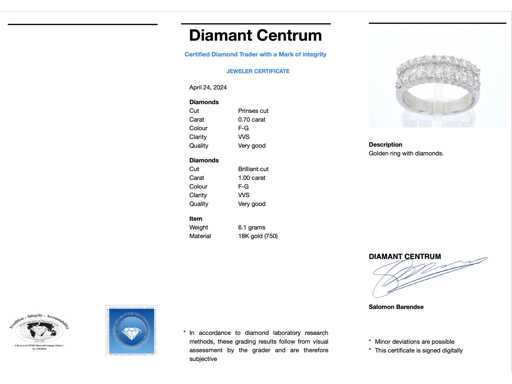 Diament: naturalny; Ilość: 11 sztuk; Cięcie: Księżniczka cięcie; Waga (karat): 0,70 karat; Kolor: F-G; Czystość: VVS; Diament (drugoplanowy): Diament; Liczba diamentów: 22 pionki; Cięcie: Brilliant cut; Waga (karat): 1,00 karat; Kolor: F-G; Czystość: VVS; Klejnot: Pierścionek; Waga: 6,1 grama; Rozmiar pierścienia (wykonany na zamówienie*): 54 (17,25 mm); Materiał: 18k złota (750); Stan zdrowia: Jakby nowy; Wyjaśnienie: Jakość została zaczerpnięta z raportu dotyczącego przedmiotu.