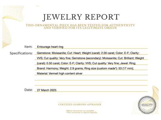 : Kamień szlachetny: Moissanite; Cięcie: Kształt serca; Waga (karat): 2,00 karat; Kolor: E-F; Czystość: VVS; Jakość cięcia: Bardzo ładna; Kamień szlachetny (drugorzędny): Moissanit; Cięcie: Genialne; Waga (karat): 0,50 karata; Kolor: E-F; Czystość: VVS; Jakość cięcia: Bardzo ładna; Klejnot: Pierścionek; Marka: Harmony; Waga: 2,9 uncji; Rozmiar pierścienia (wykonany na zamówienie*): 53 (17 mm); Materiał: Vermeil o wysokiej zawartości srebra; Stan zdrowia: Nowy; Pakowanie: szkatułka na biżuterię lub aksamitne pudełko; Wyjaśnienie: Jakość została zaczerpnięta z raportu dotyczącego przedmiotu. Wycena to ocena certyfikowanego dealera diamentów, oparta na cenach konsumpcjalnych; Dodatkowe informacje: Zmierzona waga kamieni szlachetnych jest według rozmiarów diamentów; Cena konsumpcja: € 1000