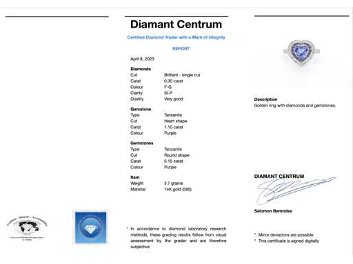 Diament: naturalny; Ilość: 32 sztuki; Montaż: Genialny i pojedynczy montaż; Waga (karat): 0,30 karata; Kolor: F-G; Czystość: SI-P; Jakość cięcia: Bardzo ładna; Kamień szlachetny: tanzanit; Ilość: 1 sztuka; Cięcie: Kształt serca; Waga (karat): 1,10 karat; Kolor: Fioletowy; Kamień szlachetny (wtórny): tanzanit; Ilość: 18 sztuk; Cięcie: okrągłe; Waga (karat): 0,15 karata; Kolor: Fioletowy; Klejnot: Pierścionek; Waga: 3,7 uncji; Rozmiar pierścienia (wykonany na zamówienie*): 54 (17,25 mm); Materiał: 14 karatów (585); Stan zdrowia: Nowy; Pakowanie: Luksusowa szkatułka na biżuterię; Wyjaśnienie: Jakość została zaczerpnięta z raportu dotyczącego przedmiotu.