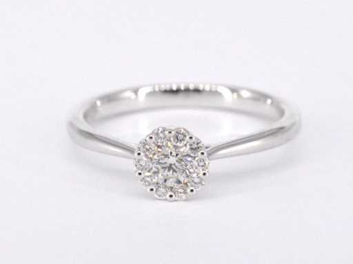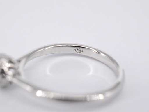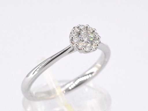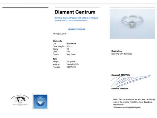 karatu Diament: naturalny; Cięcie: Brilliant cut; Waga (karat): 0,35 karat; Kolor: F-G; Czystość: USA; Jakość cięcia: Bardzo ładna; Klejnot: Pierścionek; Waga: 2,5 uncji; Rozmiar pierścienia (wykonany na zamówienie*): 53 (17 mm); Materiał: 18K gold (750); Stan zdrowia: Nowy; Pakowanie: Luksusowa szkatułka na biżuterię; Wyjaśnienie: Jakość została zaczerpnięta z raportu dotyczącego przedmiotu. Wycena to ocena certyfikowanego dealera diamentów, oparta na cenach konsumpcjalnych; Cena konsumpcja: € 3 973