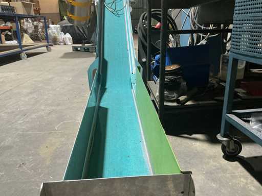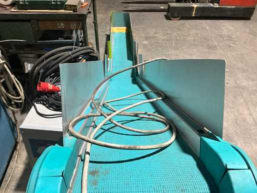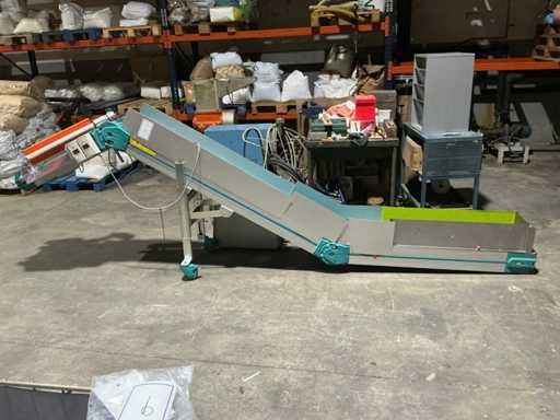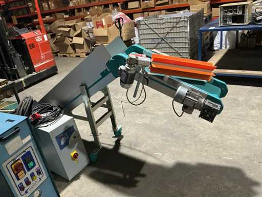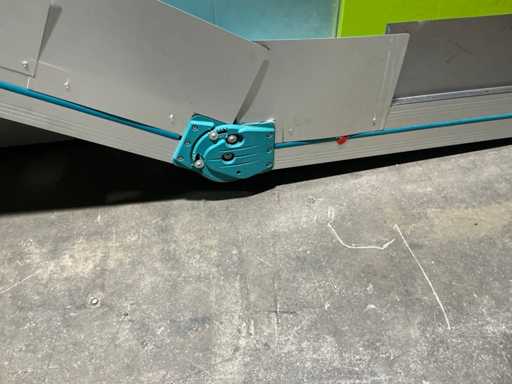 Pochylona taśma przenośna z plastikową taśmą modułową do transportu części z maszyn do kontenerów lub kolejnych procesów.