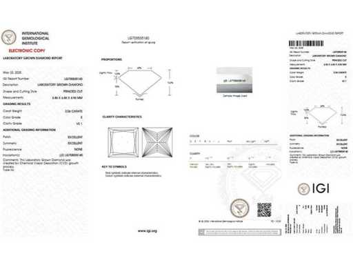 Ten laboratoryjnie wyhodowany diament posiada oficjalny certyfikat IGI oraz raport potwierdzający jego jakość. Zobacz certyfikat na zdjęciach lub zapoznaj się z tabelą powyżej, aby uzyskać szczegółowe specyfikacje. Wszystkie cechy zostały zaczerpnięte bezpośrednio z towarzyszącego raportu IGI.
