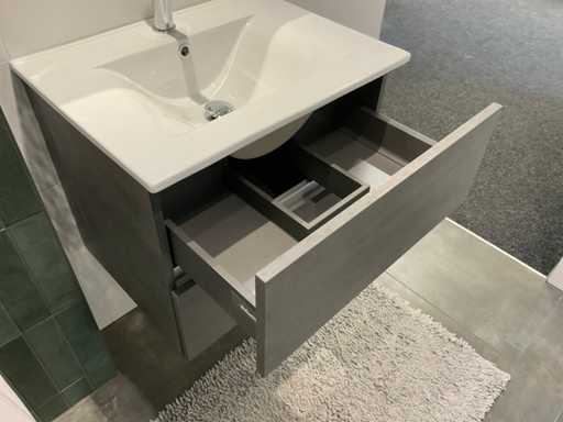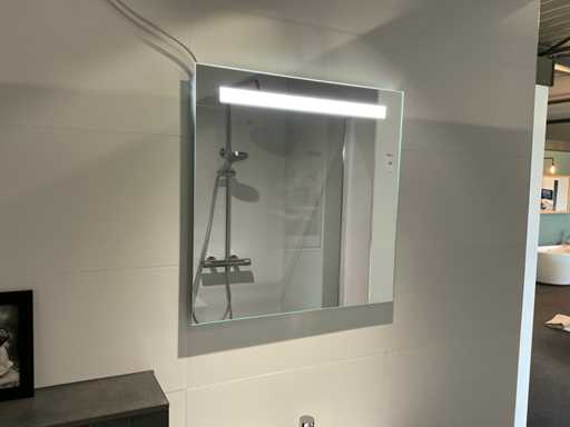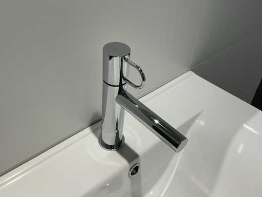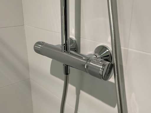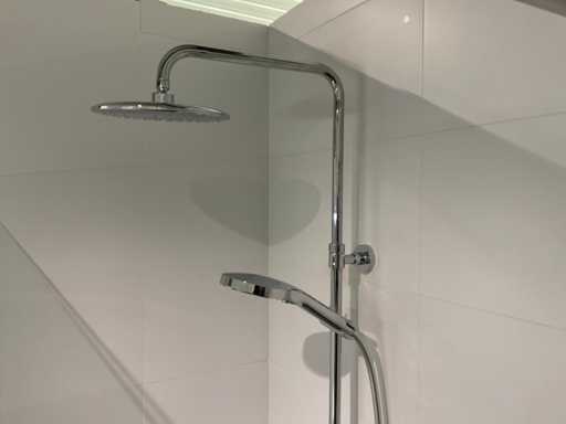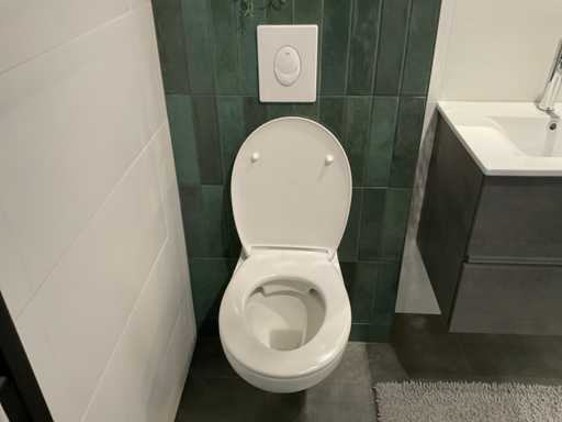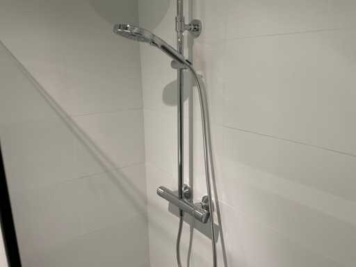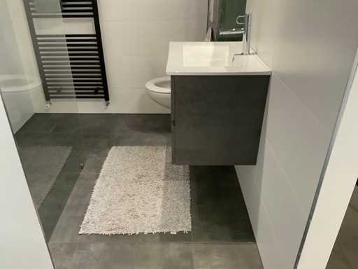 wyposażony w meble łazienkowe z 2 szufladami; wymiary około 61x47x52 cm; umywalka; Bateria jednouchwytowa "Paffoni"; lustro ze zintegrowanym oświetleniem; Toaleta wisząca "Grohe" z deską z cichym domykaniem; zestaw prysznicowy ze strumieniem deszczowym z drążkiem prysznicowym i główką prysznicową; kabina prysznicowa typu walk-in; rozmiar około 115x200 cm; grzejnik dekoracyjny; wymiary około 172x60 cm