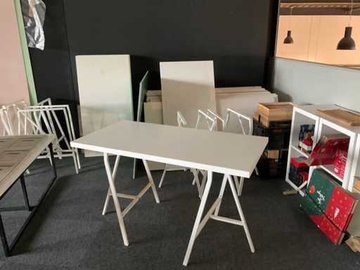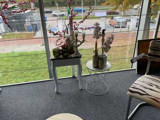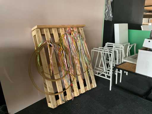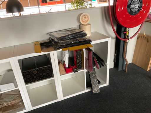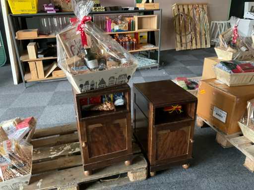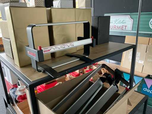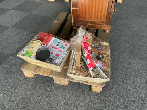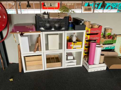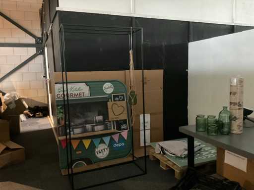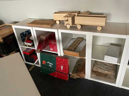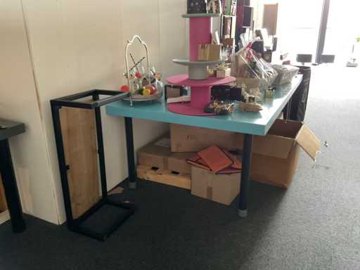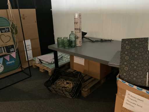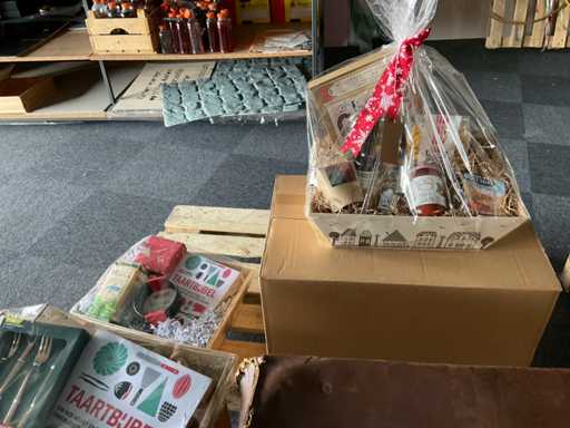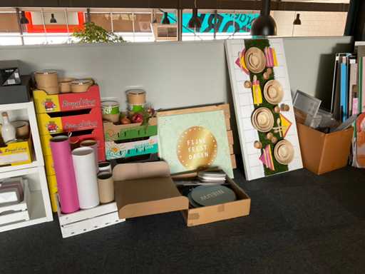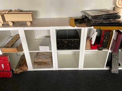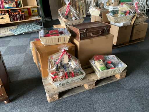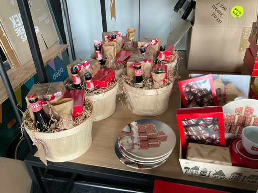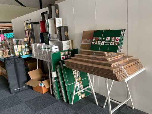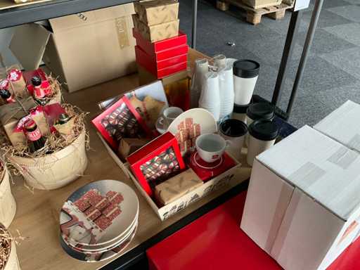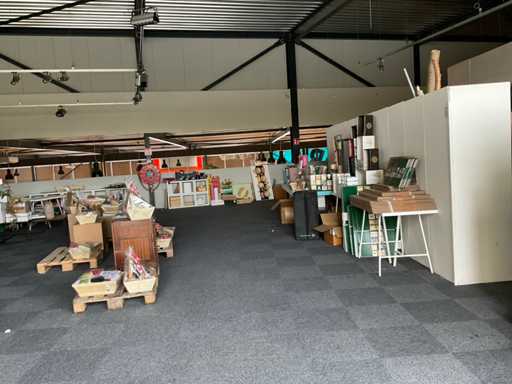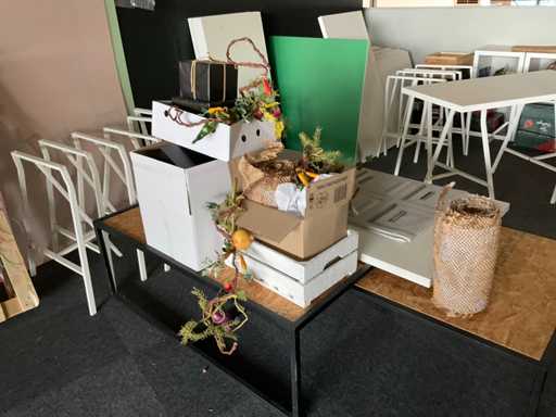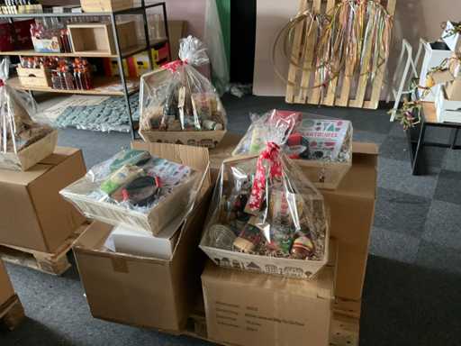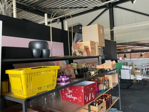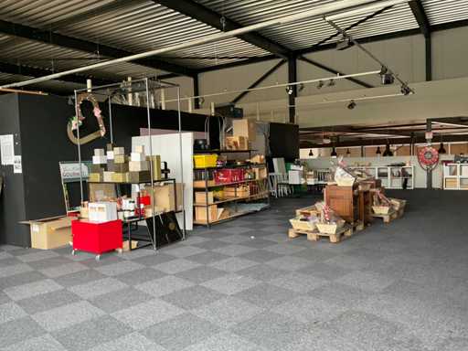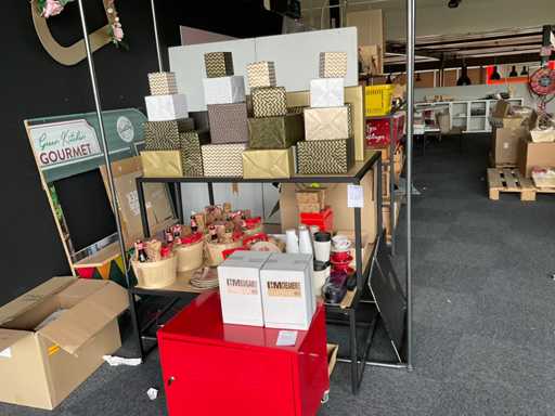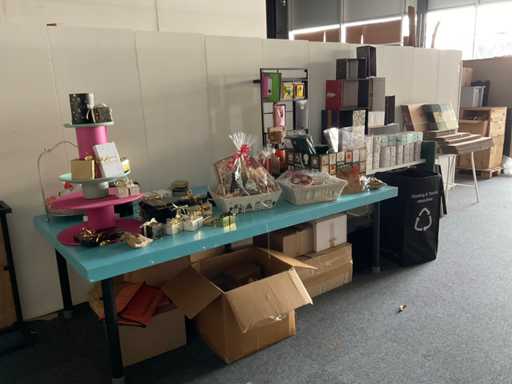 Zawartość przestrzeni składająca się z etagere, opakowań świątecznych, wazonów, pudełek do pakowania świątecznego, materiałów dekoracyjnych, kubków, systemu rozwijania Legro, opakowań na prezenty, stołów dekoracyjnych, opakowań na prezenty na wino. Stoły do pakowania 244 x 122 x 75 cm i 272 x 120 x 75 cm oraz puste pudełka upominkowe do dekoracji. Parking znajduje się na 1. piętrze i nie ma windy.
