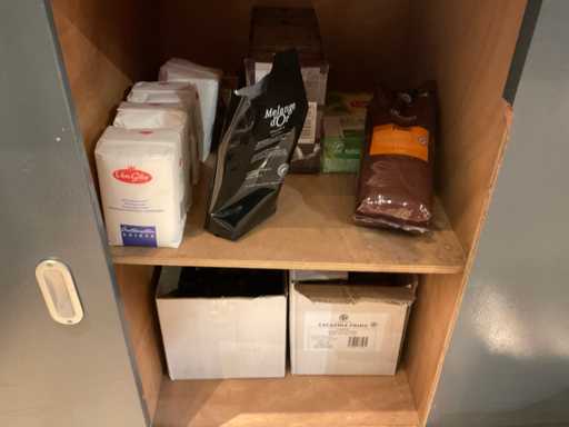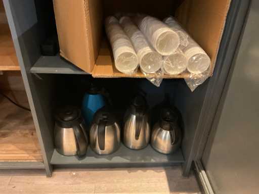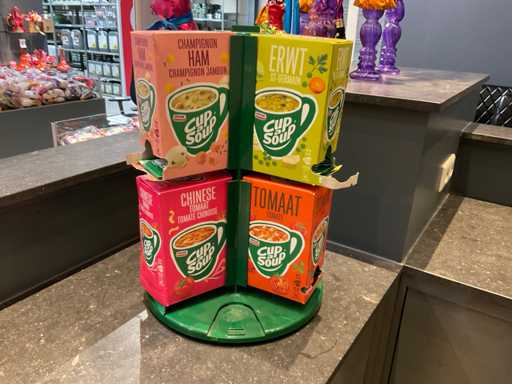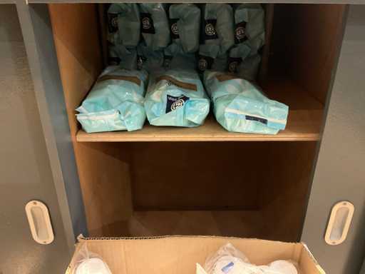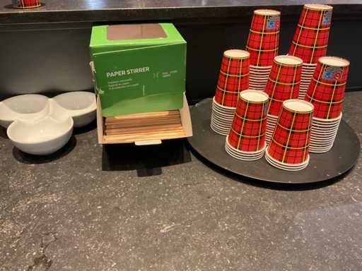 Zawartość batonika składającego się z tostera, dzbanków do kawy, jednorazowych kubków, bulionu z cukru i mieszanki kakaowej, kubka z uchwytem na zupę