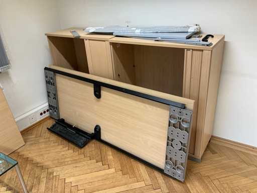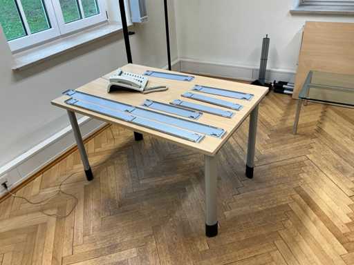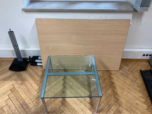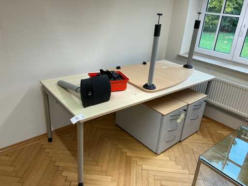 2x stół, 2x szafka z szufladami, 2x szklany stół, 4x szafka na dokumenty i różne inne luźne przedmioty