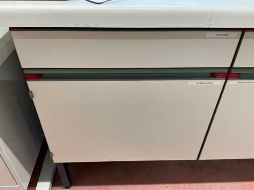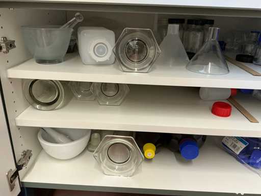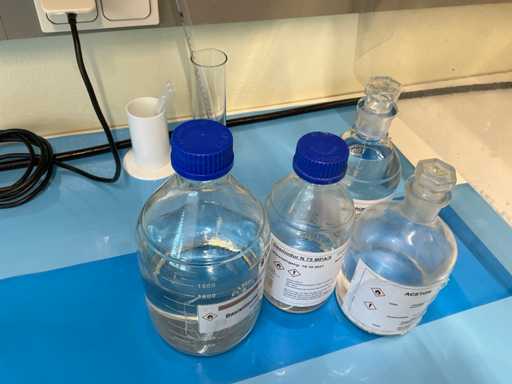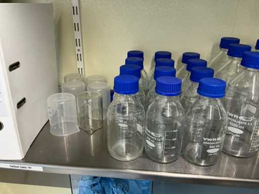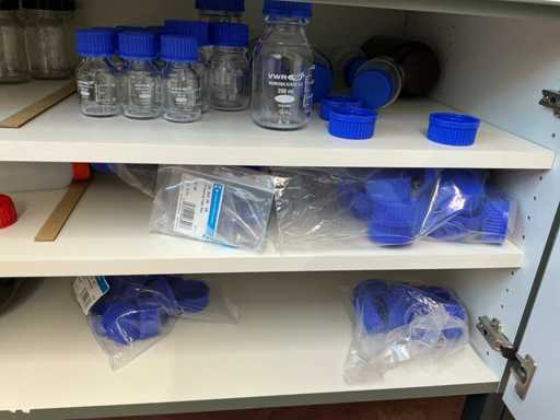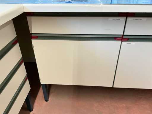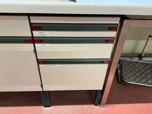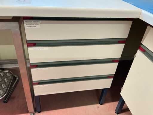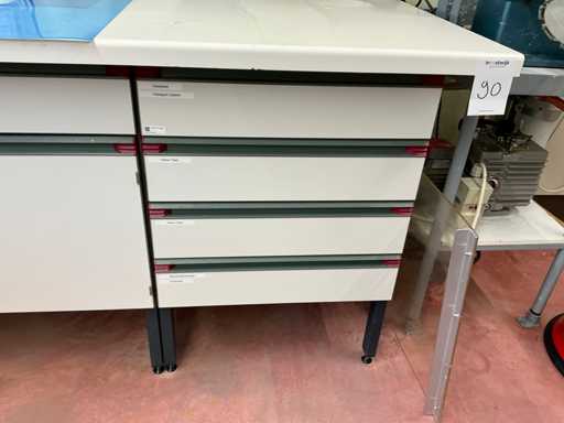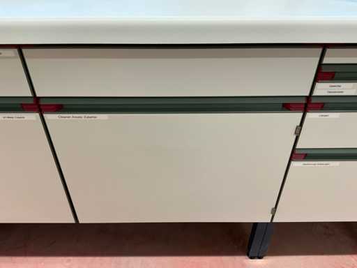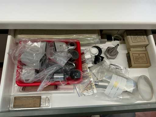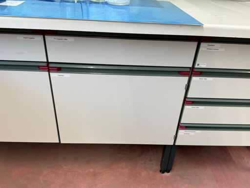 Stół laboratoryjny, 4x szafka laboratoryjna, 4x szafka z szufladami laboratoryjnymi, różne wyroby szklane, różne urządzenia laboratoryjne.
