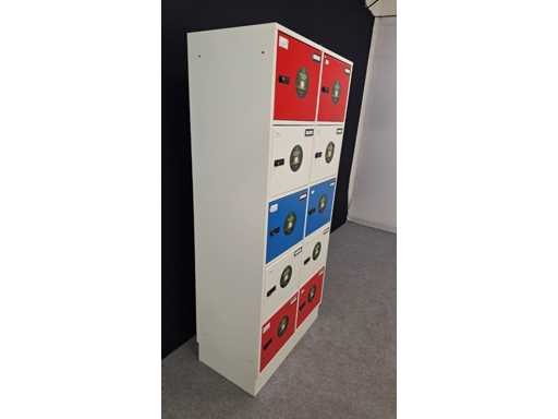 Cabinet completely in metal color white, equipped with 10 doors color Red/White/Blue, each door equipped with a code lock for personal safety and a personal number, all locks are reset, user manual available, dim. 1950 x 900 x 500 mm (H x W x D), dimensions lockers 450 x 350 x 500 mm (W x H x D), in good condition.