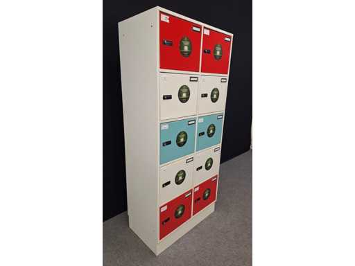 Szafka całkowicie w metalicznobiałym kolorze, wyposażona w 10 drzwi w kolorze czerwonym/białym, każde drzwi wyposażone w zamek kodowy dla bezpieczeństwa osobistego oraz numer osobisty, wszystkie zamki zostały zresetowane, instrukcja obsługi dostępna, przyciemnione. 1950 x 900 x 500 mm (od x sześć x przy, wymiary), szafki 450 x 350 x 500 mm (szw. x wysokość x przymierzenie), w dobrym stanie.