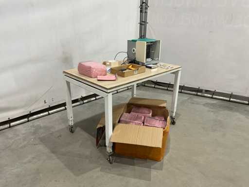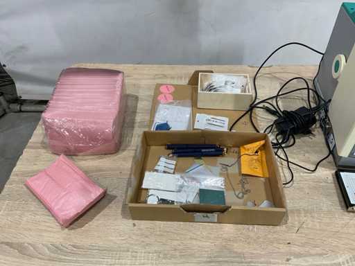 działka zawiera maszynę grawerską z akcesoriami oraz pudełko z kopertami wysyłkowymi; Wymiary wyrażone są w cm