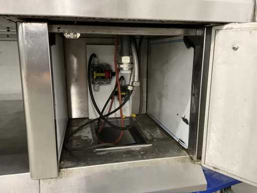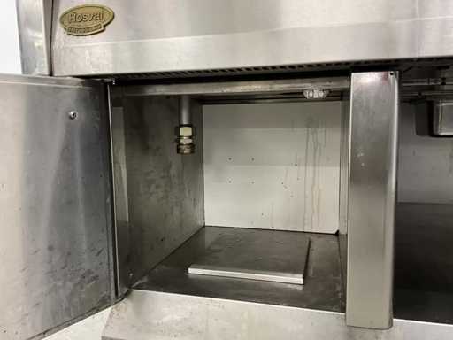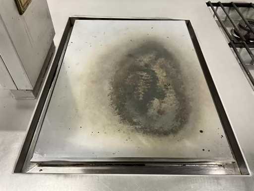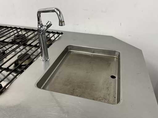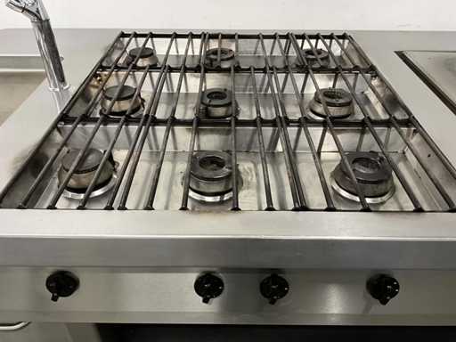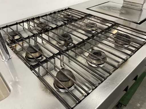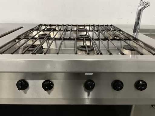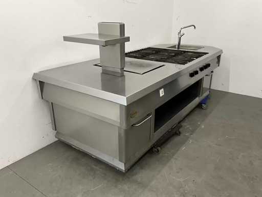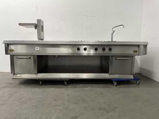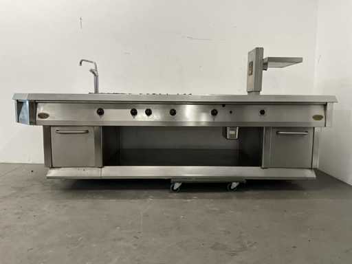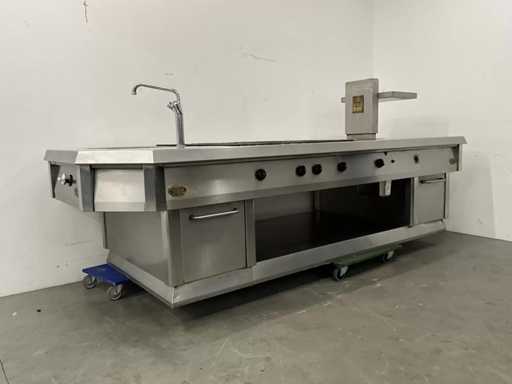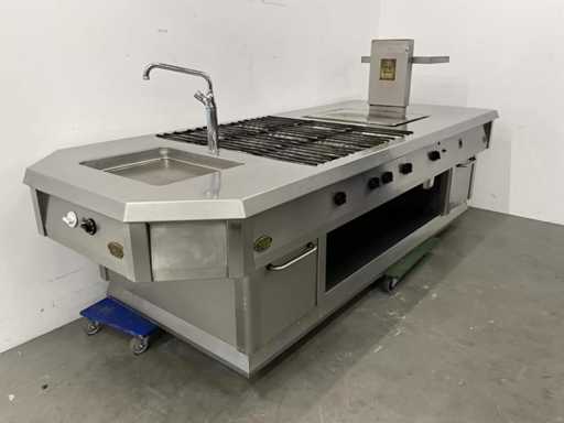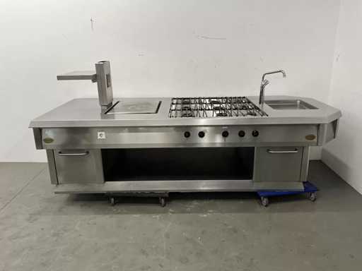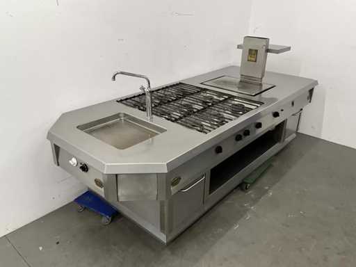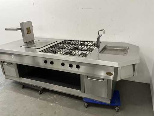Wyposażony w 9-palnikową kuchenkę gazową, płytę do patelni, zintegrowaną patelnię, kran z mikserem i etagere.
