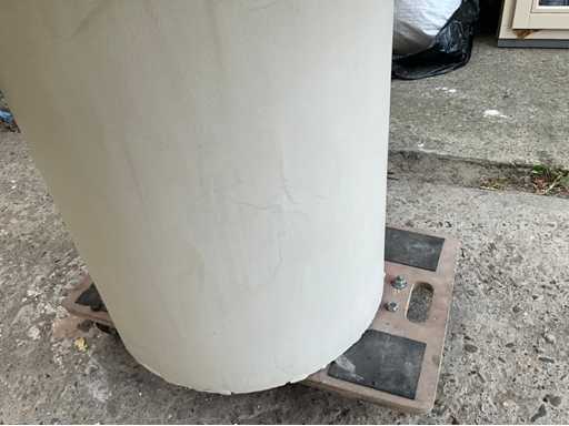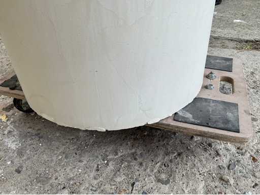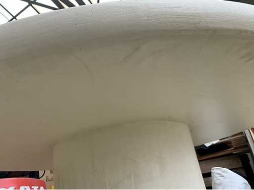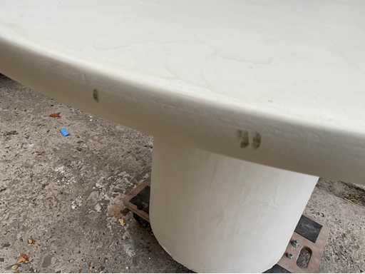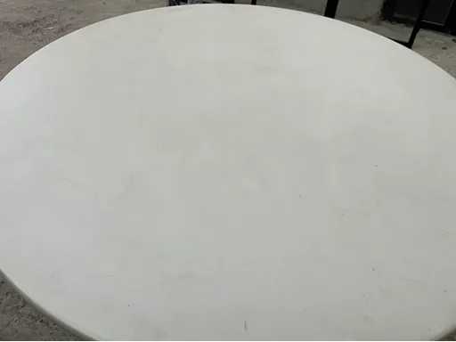 Solid round table with robust cylindrical base, fully finished in a slight decorative microtopping - The table has a sleek, minimalist look and fits well in both modern and industrial interiors - Some minor signs of wear, scratches and edge damage visible on top and foot (see photos) - seller can load