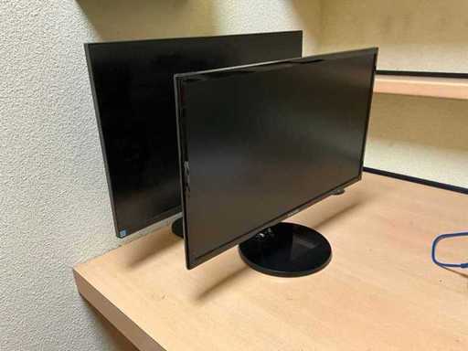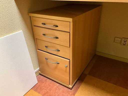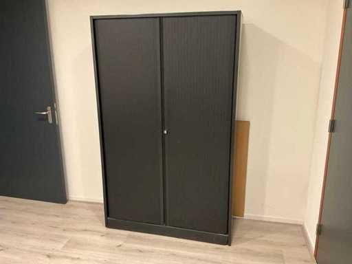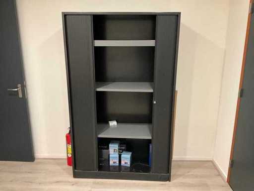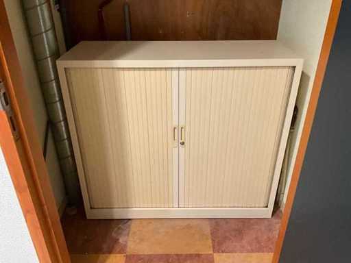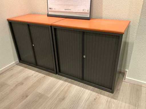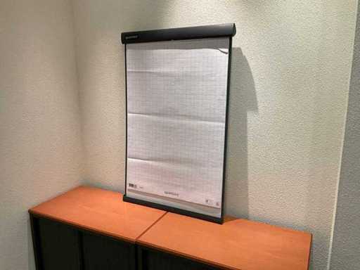 Składa się z: 1x szafy drzwi rolkowych Ahrend H194xB120xD45cm, 2x szafy z drzwiami rolkowymi niskiej H74xB80xD45cm, flipchart Quantore, szafki drzwi rolkowych Manutan białej H105xB120xD46cm, drewnianej komody, monitora AOC, monitora Samsung i okablowania