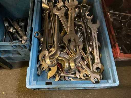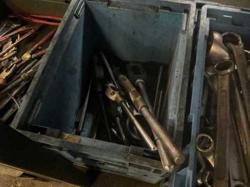 Dotyczy 7 skrzyń z m.in. kluczami otwartymi o różnych rozmiarach, dużym zestawem nasadek, smarownicami, szczypcami i młotkami, w tym skrzynią