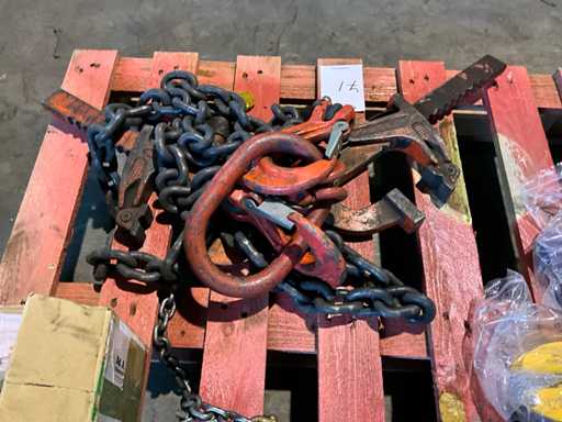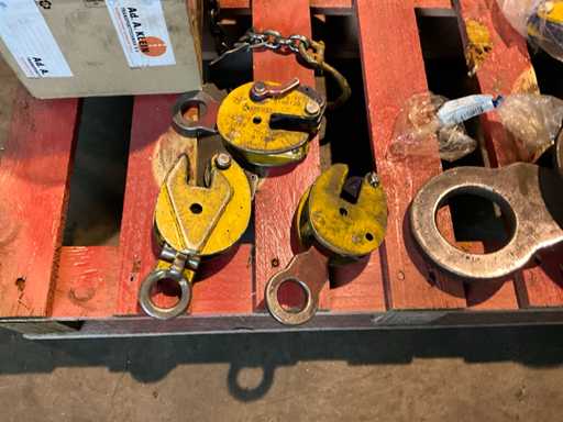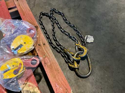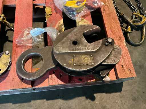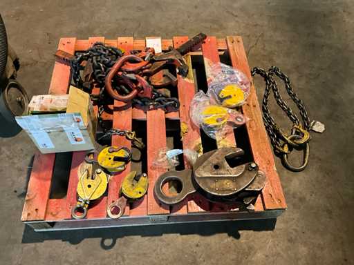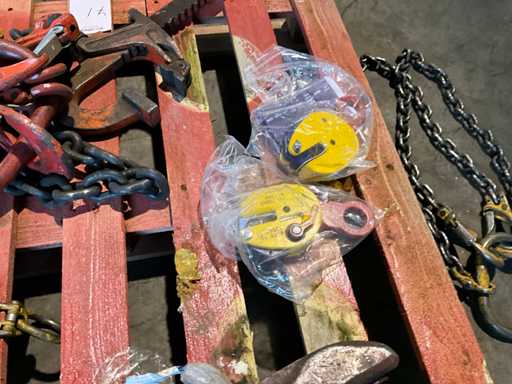 w tym 2x nieużywane zaciski płytowe (2025, 0-13 mm, 75-750 kg), 3x zaciski płytowe (0-13 mm, 75-750 kg), łańcuchy podnoszone 2-skokowe