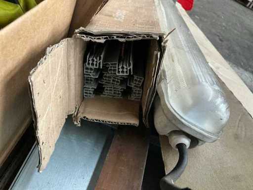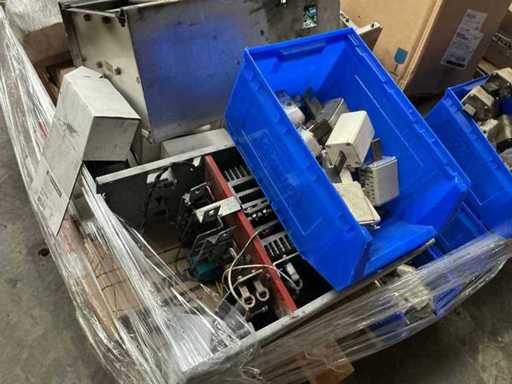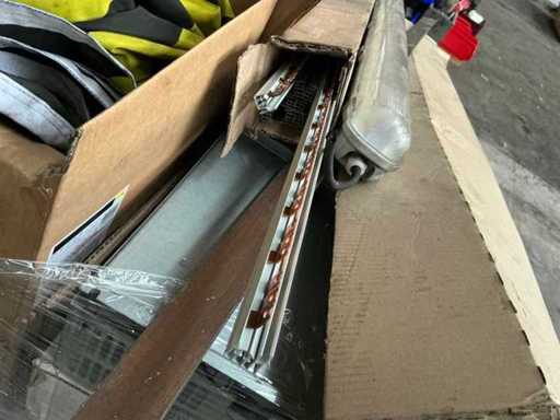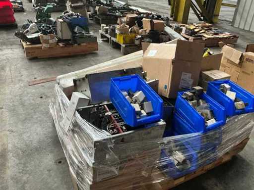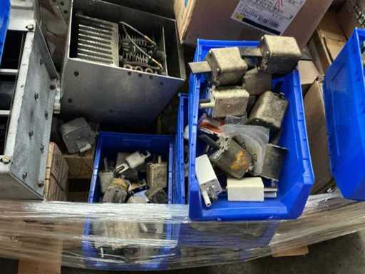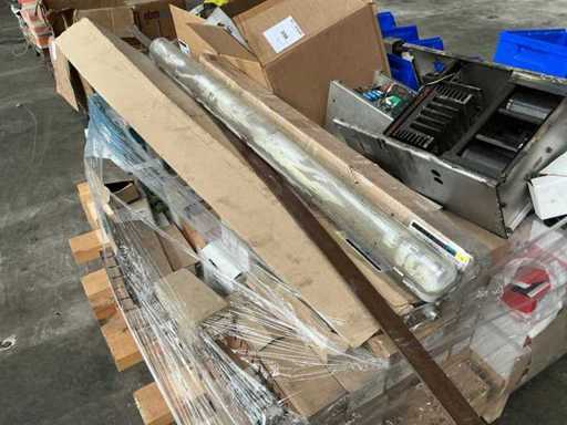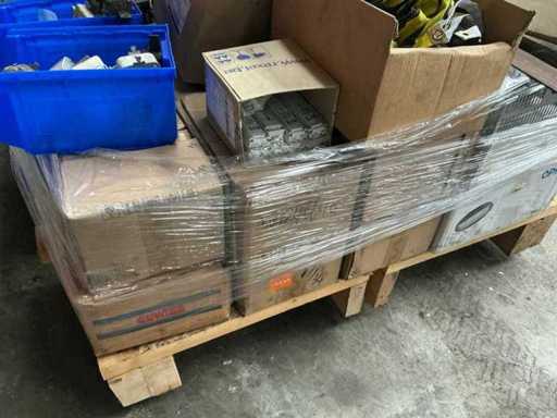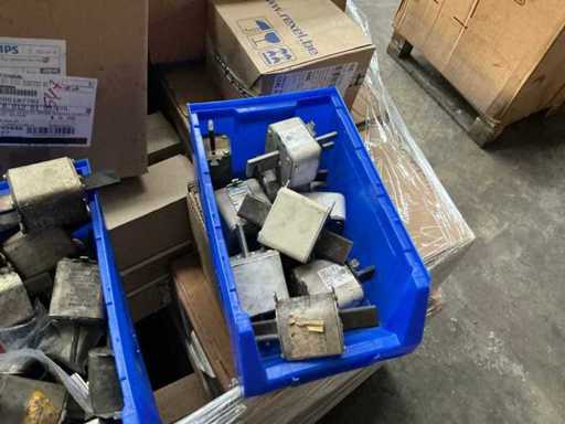 W tym szyny łączące Hager, lampy oraz różne materiały do instalacji elektrycznych. Na jednej palecie.