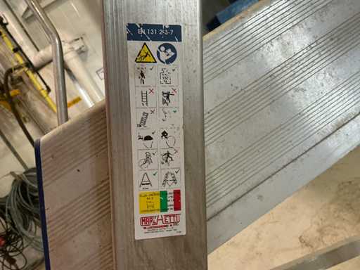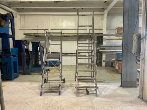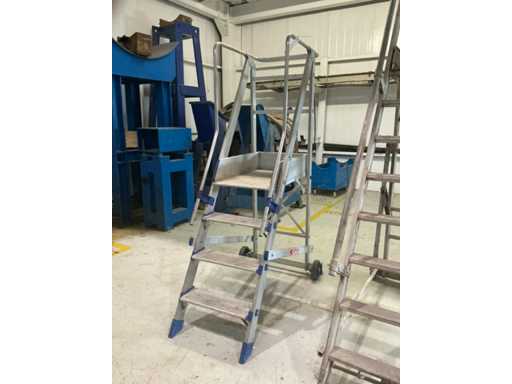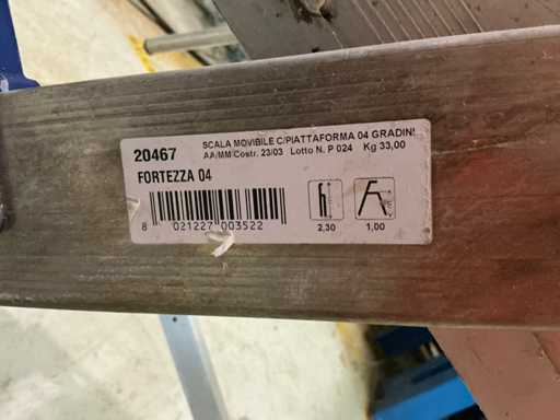 - Drabina MARCHETTI FORTEZZA 04: rok 2023, maksymalny udźwig 150 kg, szerokość stopnia 500 mm, wymiary platformy 500 x 750 mm, wysokość platformy od ziemi 980 mm, 2 koła.