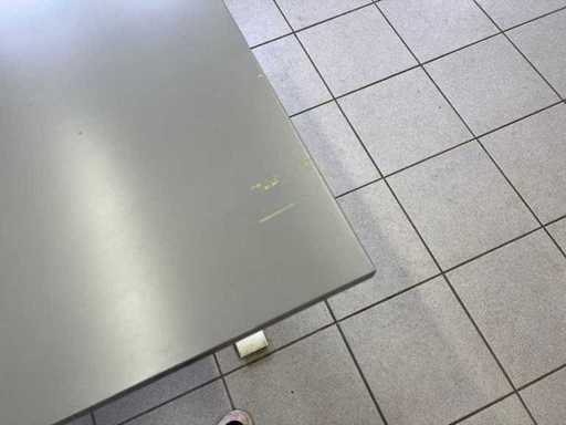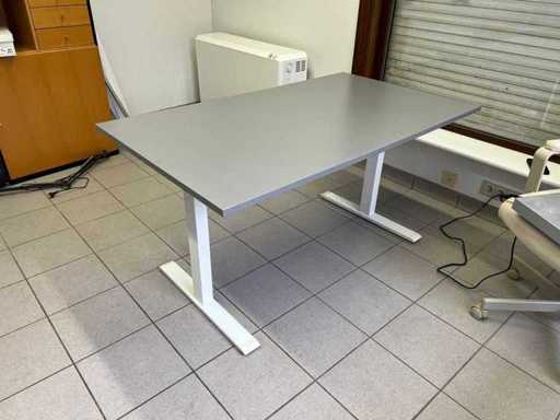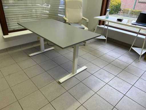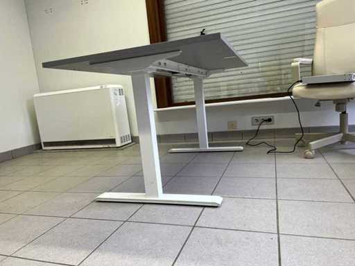 Manually adjustable sit-stand desk from IKEA with sturdy metal base. Height easily adjustable via crank mechanism. Suitable for ergonomic working from home or office environment. Stable construction. Slight signs of use visible on the worktop (see photos). This was electronically adjustable but is broken and part has been removed.