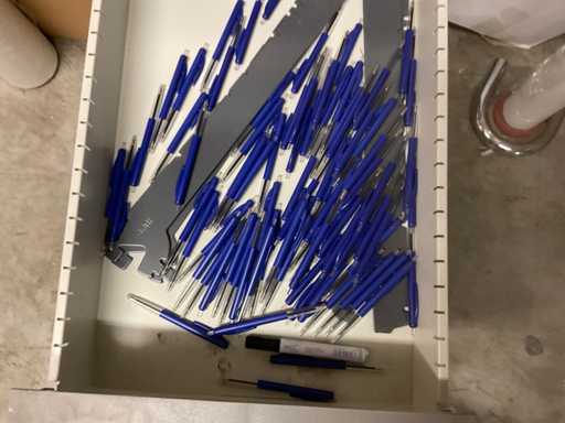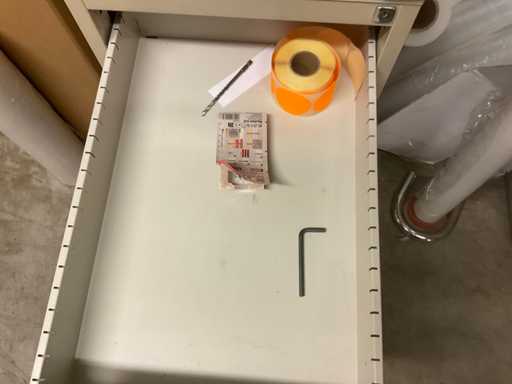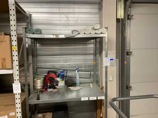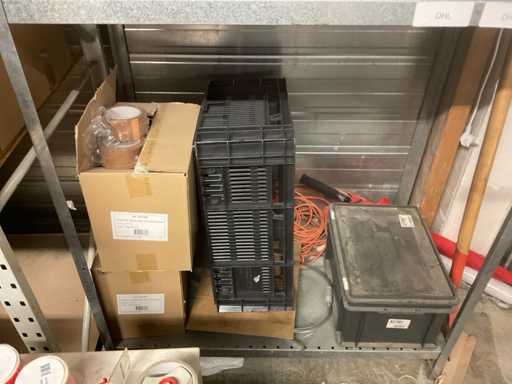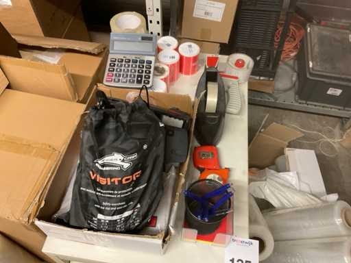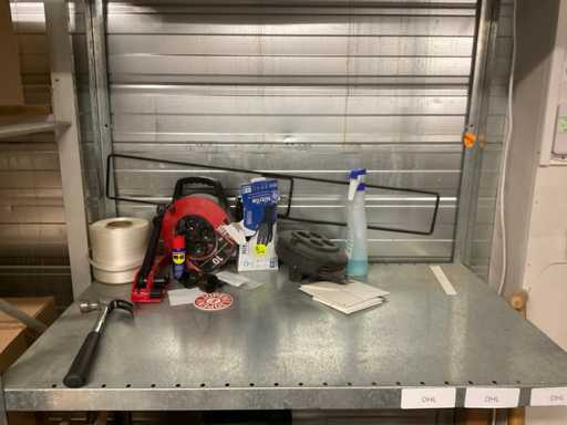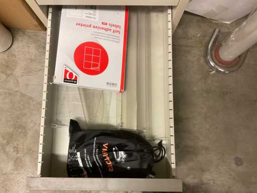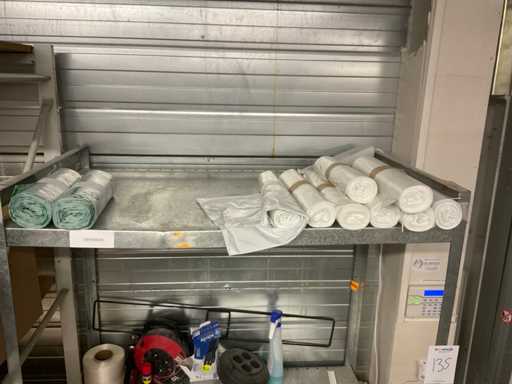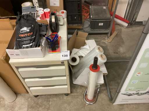 Składa się z regału o wymiarach ok. 100x60x200 cm wraz z zawartością w.o. Taśma klejąca, worki na śmieci, przedłużacz itp., w tym komoda z zawartością Długopisy, ochraniacze na buty, folia uszczelniająca, uchwyt na plecak i środki czyszczące.
