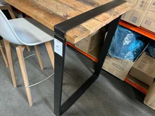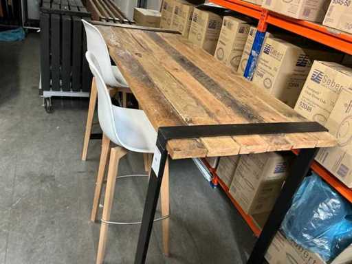 Solidna drewniana płyta, czarne metalowe nogi, z dwoma stołkami barowymi