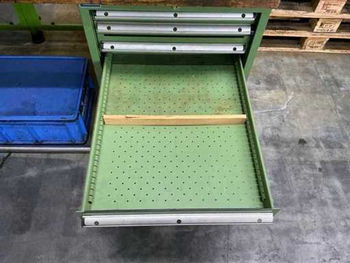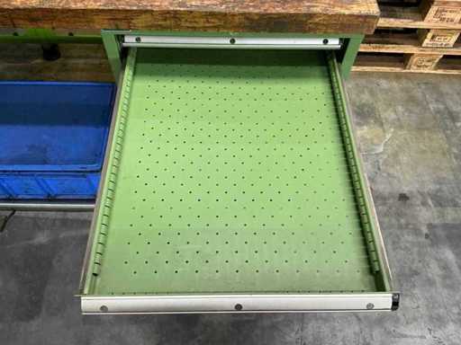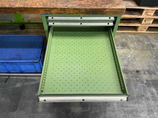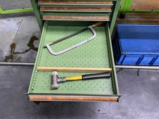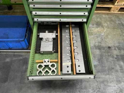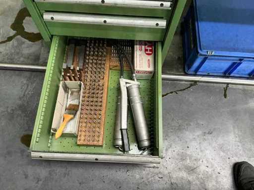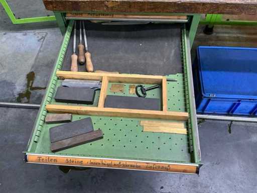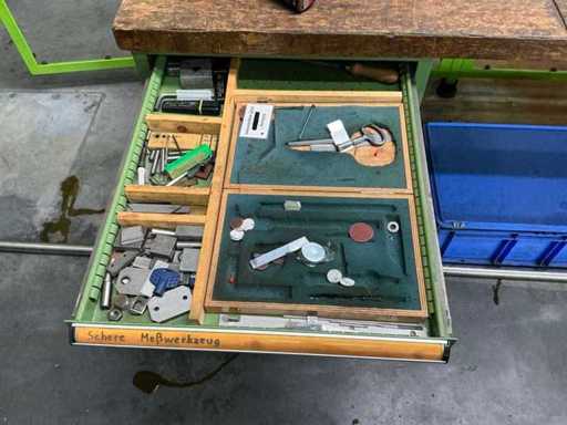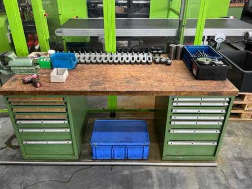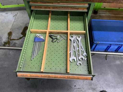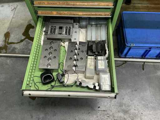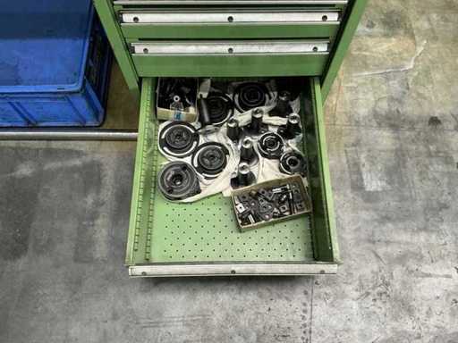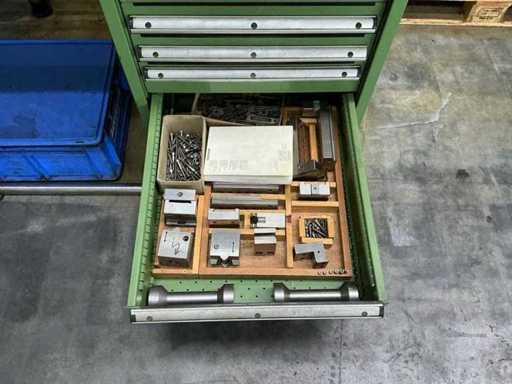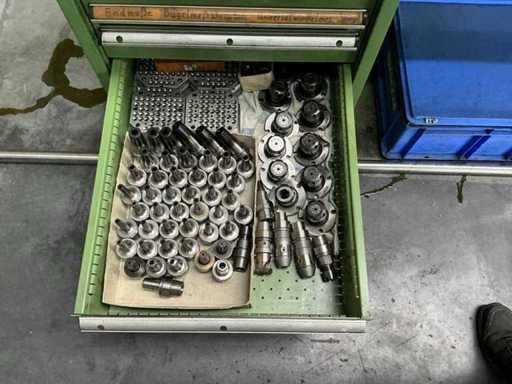 W tym imadło GARANT-L 125, 2 szafki pod montażem po 7 szuflad, różne narzędzia ręczne, uchwyty na narzędzia kurczliwe SK40 oraz tuleje zaciskowe