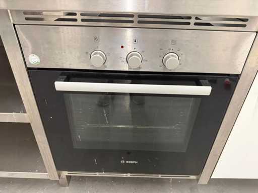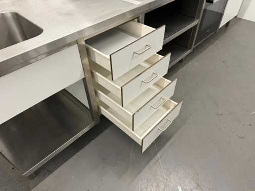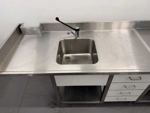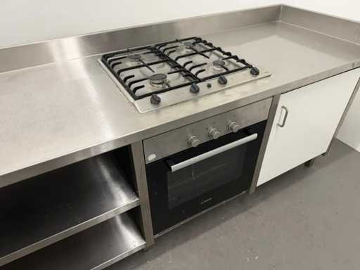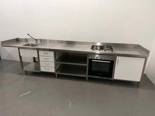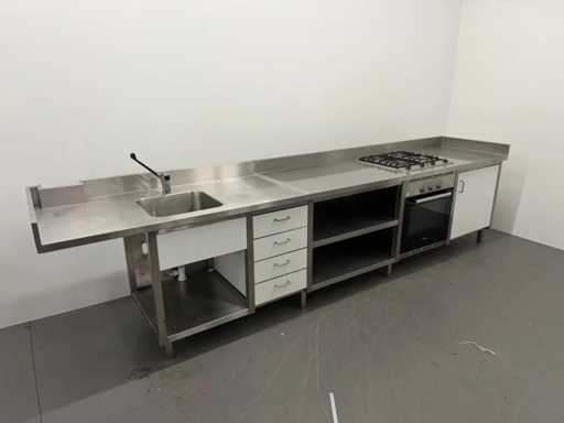 Stół roboczy ze stali nierdzewnej z piekarnikiem, zlew z kranem i kuchenka gazowa z 4 palnikami.