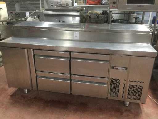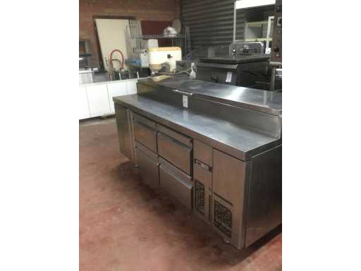 Chłodniczy stół warsztatowy z wbudowaną sałatką; wyposażony w 2 zestawy szuflad po 2 szuflady; kontroler-termostat nie jest podłączony; sprężarka pracuje;
