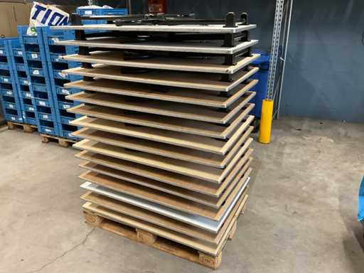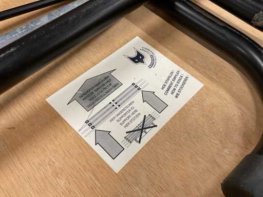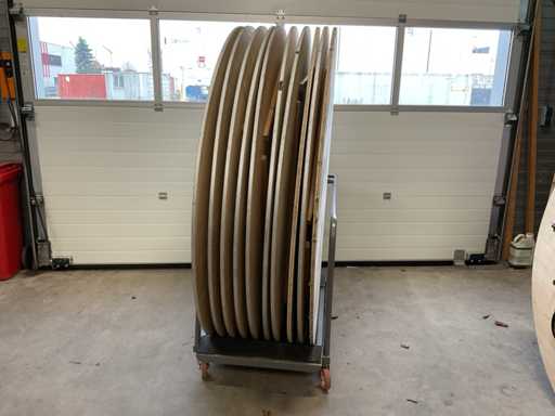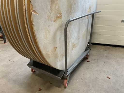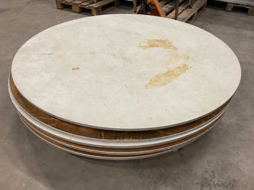 Składa się z: 16x stół składany, 11x nakładka okrągła, śr. 180cm i 6x okrągła górna pokrywa, średnica. 150cm i 1x wózek transportowy z tacą transferową.