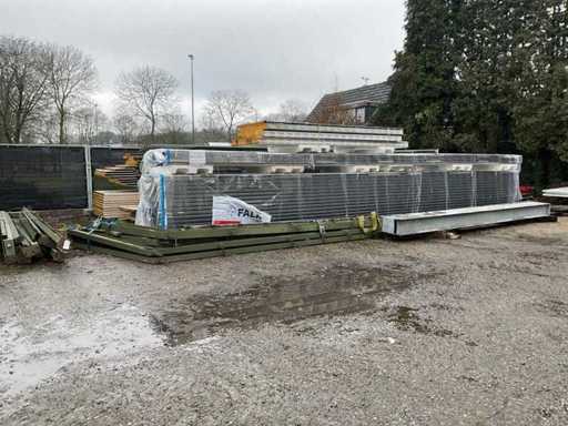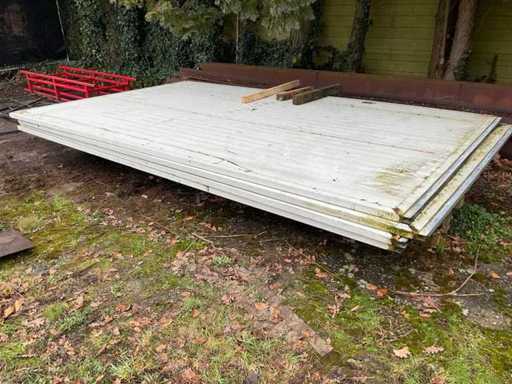 Wysokość tylnej części 2500 mm, 4x drzwi przesuwne szerokość całkowitej 10 mt, wraz z panelami kanapkowymi okładzinami ścian wewnętrznych, działka została już rozebrana (zobacz zdjęcia). W tym nowe blachy dachowe