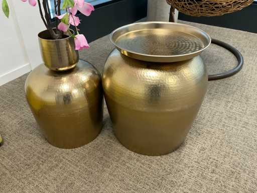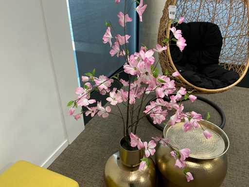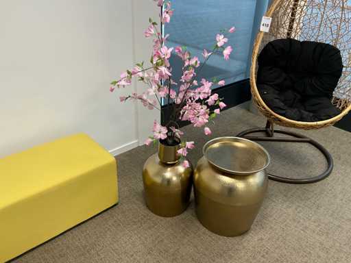Działka składa się z 2x tabury/ławki o wymiarach 118x50x42cm, 1 stolika bocznego w kolorze złotym oraz 1 kwiatów dekoracyjnych w doniczkach