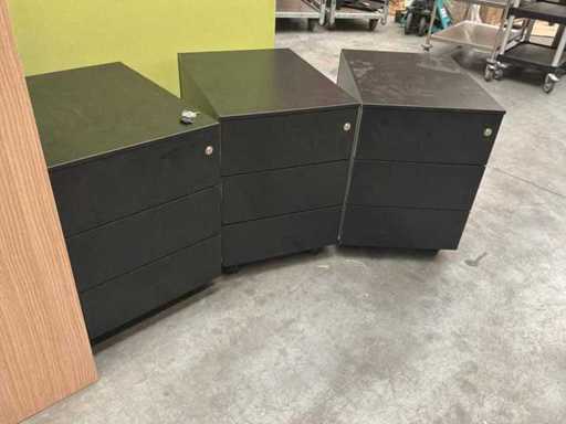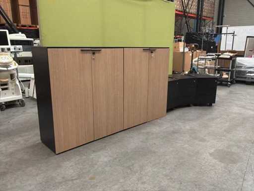 2x szafka na dokumenty Bralco o wymiarach: (w100 x d46 x h116 cm), 3x szafka biurkowa o wymiarach: (w42 x d57 x h59 cm). W przypadku jednej szafki biurkowej klucz jest łamany w zamku. Raz przy szafce na dokumenty złamała się noga.