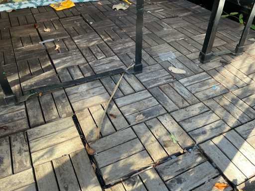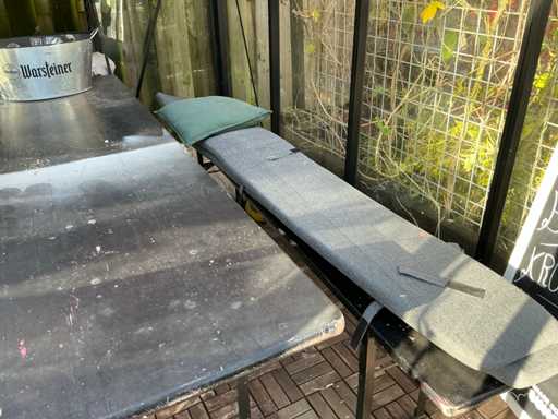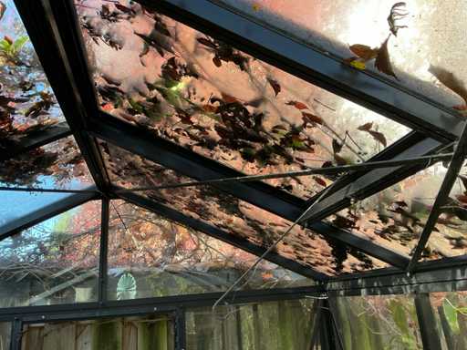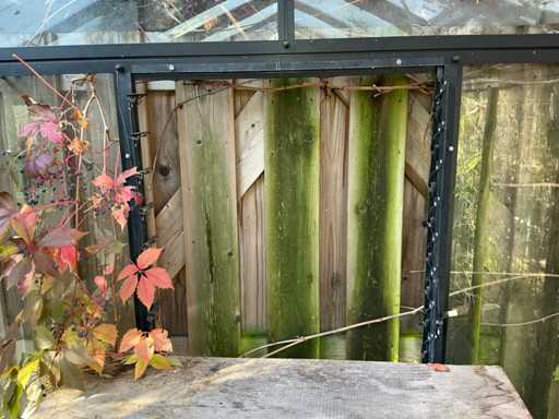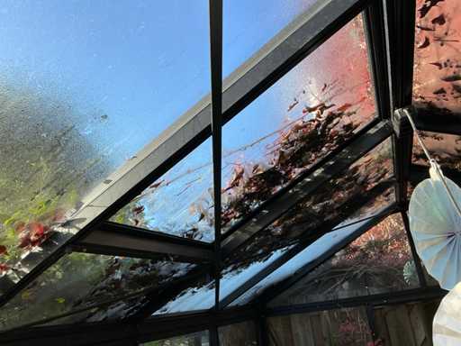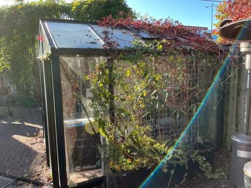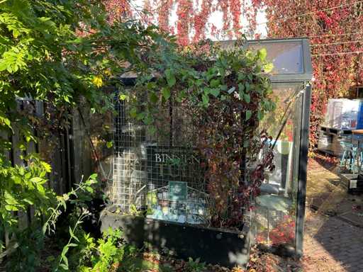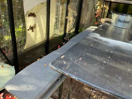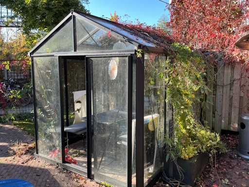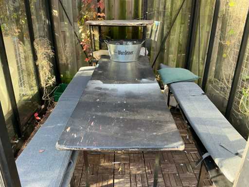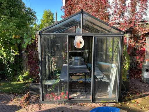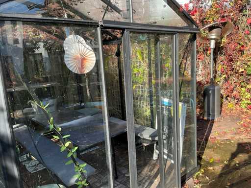 Wyposażony w drzwi przesuwne, okno boczne i 2x okno dachowe; Szkło bezpieczne; W tym pokazane meble składające się z: stołu, ławek, poduszek, drewnianych elementów tarasowych i różnych akcesoriów; 2x donica z siatką.