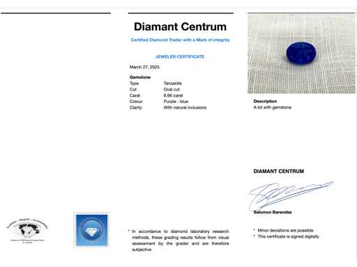Kamień Szlachetny: Tanzanit; Ilość: 1 sztuka; Cięcie: Owalne cięcie; Waga (karat): 6,66 karat; Kolor: Fioletowy - niebieski; Czystość: z naturalnymi inkluzjami; Stan zdrowia: Nowy; Pakowanie: Gem Box; Wyjaśnienie: Jakość została zaczerpnięta z raportu dotyczącego przedmiotu. Wycena to ocena certyfikowanego dealera diamentów, oparta na cenach konsumpcjalnych; Cena konsumpcja: € 2 640