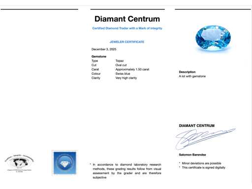 , Kamień: Topaz; Ilość: 1 sztuka; Cięcie: Owalne cięcie; Waga (karat): ok. 1,50 karata; Kolor: szwajcarski niebieski; Czystość: Bardzo wysoka czystość; Stan zdrowia: Nowy; Pakowanie: Gem Box; Wyjaśnienie: Wycena to wycena certyfikowanego dealera diamentów, oparta na cenach konsumpcjalnych; Cena konsumencka: € 385,-