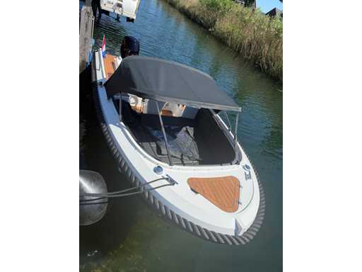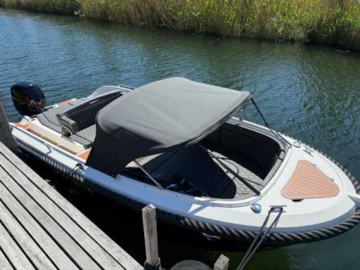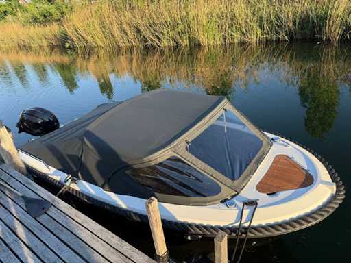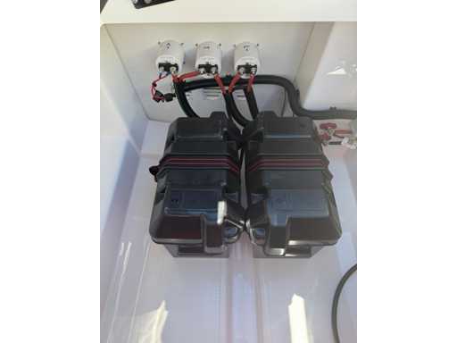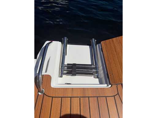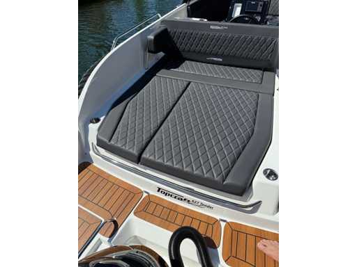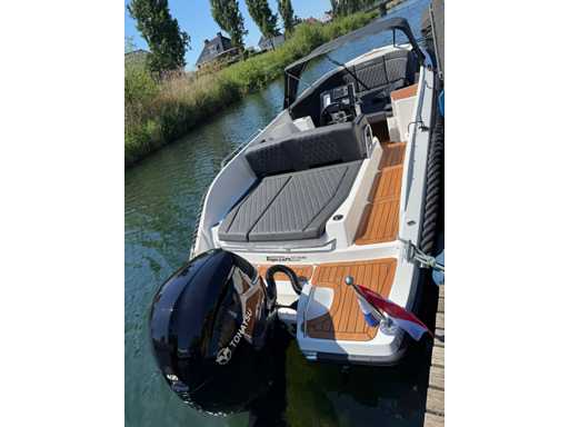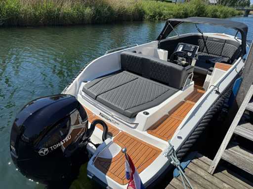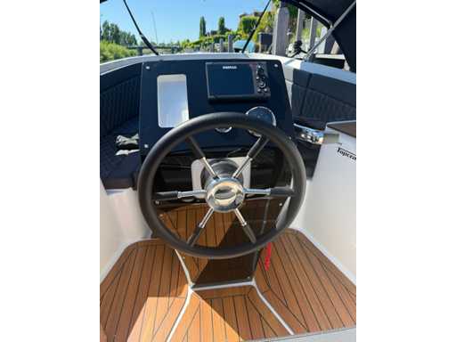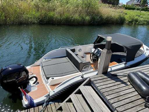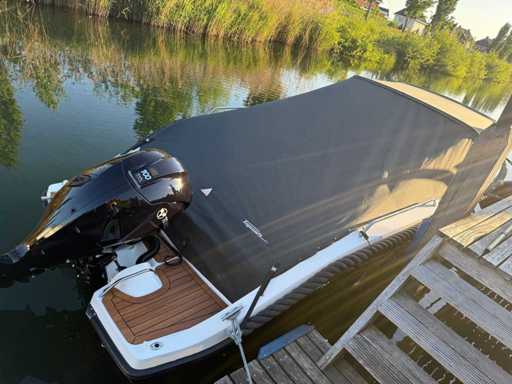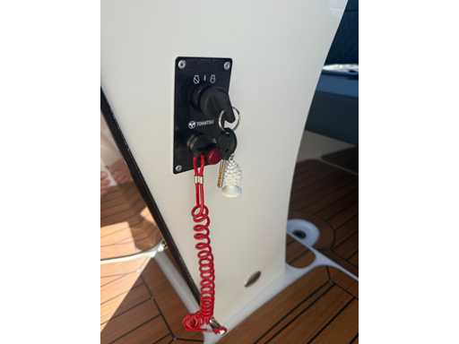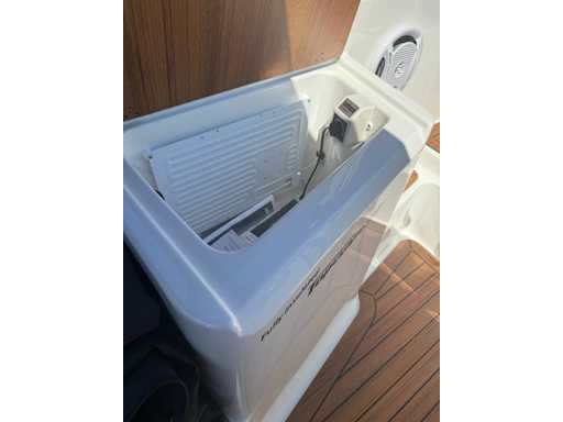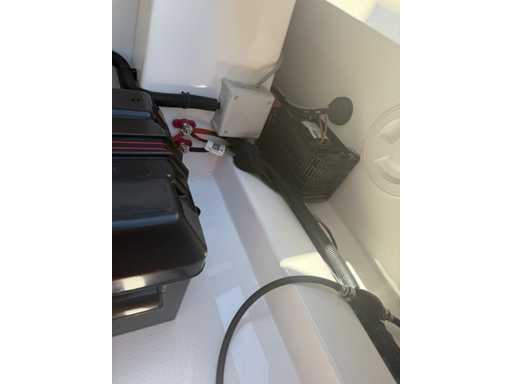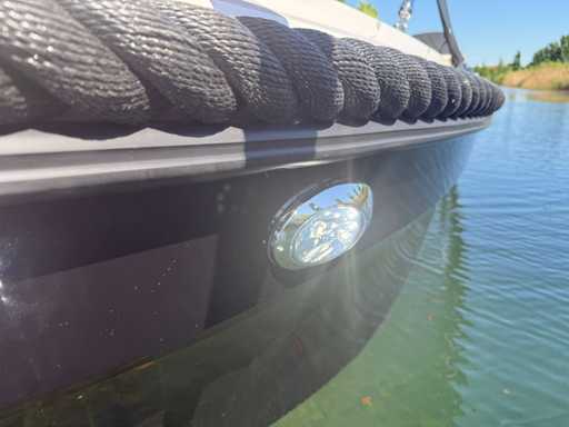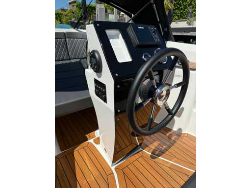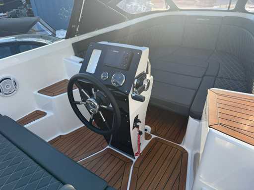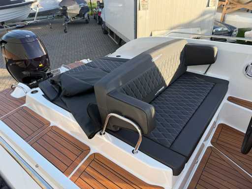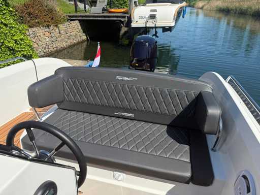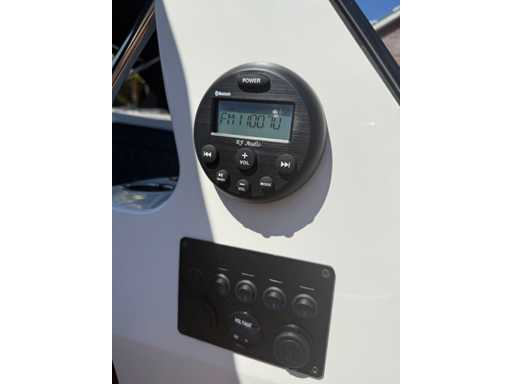 Łódź wyposażona jest w instalację radiową blue-tooth, nawigację Simrad, echosondę, wskaźnik temperatury, prędkościomierz itp. Lodówka wbudowana w kondensator. Luksusowa tapicerka okienna. Leżak zamienia się w stół. 2x akumulator z przełącznikami między silnikiem a akcesoriami. Wbudowana przepustnica. Wykończenie silnika. Rozkładany dach ze zdejmowaną przednią szybą. Podłoga HPL. Światła nawigacyjne. Reflektory LED wbudowane w kadłub. Niebieskie oświetlenie kokpitu. Oparcie do siedzenia do postawienia na leżaku z tyłu. Kierownica Lux. Górna lampa za stalą nierdzewną. Flaga za stalą nierdzewną. Silnik i łódź nadal na gwarancji. Oglądanie po wcześniejszym umówieniu!