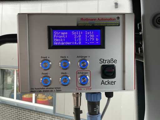 Zawieszenie na przedniej osi, system zmiany ciśnienia powietrza Rottmann, pneumatyczna kabina, drążek holowny K80, regulowany automatyczny dźwig, czujnik obciążenia, hamulce pneumatyczne, 6x waga kół, kontrola błotników i przednich hamulców, 540/540e/1000 obr./min, klimatyzacja, szerokość rozstawu 1850 mm,