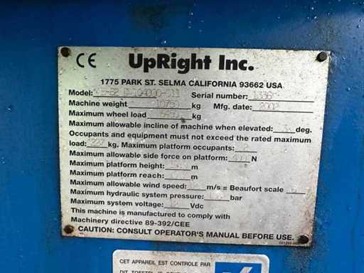 Pionowy AB-62D104000-011 z podnoszeniem z wysięgłem przegubowym; rok budowy 2002; Silnik Perkins z silnikiem diesla z silnikiem 4 cylindrów; 60-80 KM; maksymalna wysokość peronu 18,9 metra; poziomy zasięg 10,7 metra; Masa własna ok. 10 750 kg