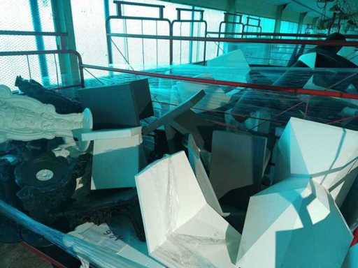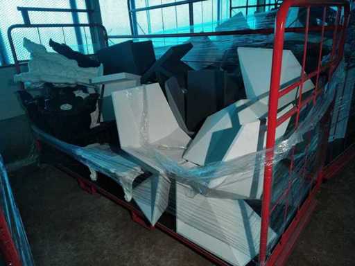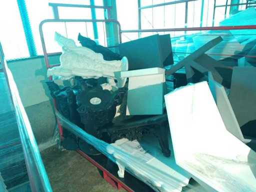 1900*1100*1550 wózek obsługi zawierający 8 czarnych stołów LORD OF LOVE (bez blatów), 3 białe stoliki LORD OF LOVE (bez tac), 1 czekoladowy stolik kawowy DUKE OF LOVE, biały stolik kawowy DUKE OF LOVE, 3 białe krzesła VERTEX, 2 szare krzesła VERTEX, 1 biały stolik kawowy TOY, 3 szare stoliki kawowe TOY