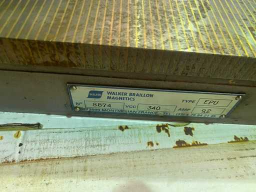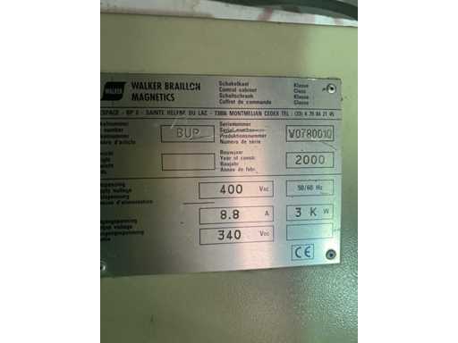 Numer seryjny: 8874. Moc: 340 VDC, 9,2 A (płyta); Jednostka sterująca: 400 V AC, 3 kW, 8,8 A. Zawiera zasilacz modelu BUP. Typ: Płyta elektromagnetyczna z cienkimi biegunami do precyzyjnego zaciskania. Certyfikowany przez CE. Wyprodukowane we Francji.