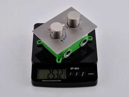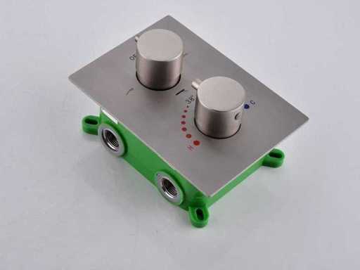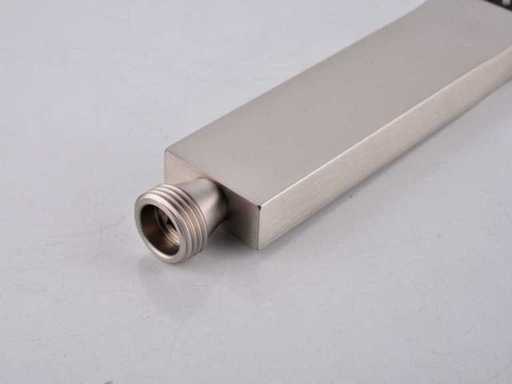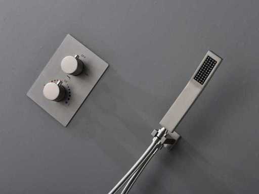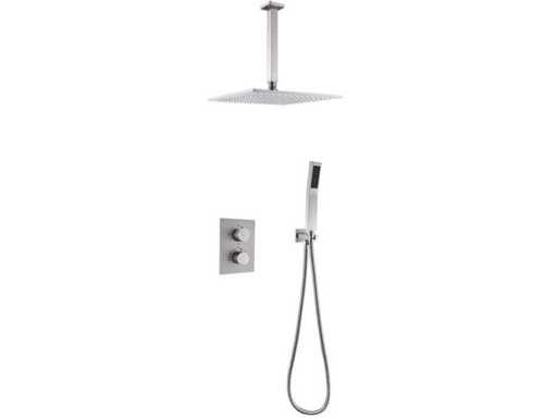 Wybór różnych kolorów: chrom lub szczotkowana stal nierdzewna (wybór koloru prosimy o podanie w dniu odbioru) Mosiądz, termostat Smart Control, ceramiczne wnętrze, głowica prysznicowa 30x30 cm, regulowany prysznic z wężem prysznicowym i mosiężnym zawieszeniem, wyposażony w wylewkę do kranu wanowego, głowicę prysznicową z plastikowymi wylewkami do łatwego usuwania kamienia, głowicę prysznicową można pochylać i obracać, w tym wbudowaną skrzynkę dla łatwego montażu, zestaw wyposażony jest zarówno w pręt ścienny, jak i Pręt sufitowy