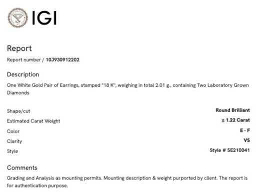 Diamond: Eco (lab-grown); Quantity: 2 pieces; Cut: Brilliant cut; Weight (carat): 1.22 carat; Color: E-F; Purity: USA; Cut: Very good; Certificate: IGI; Certificate number: 10J930912202; Jewel: Earrings; Weight: 2 grams; Dimensions/length: 1.4 x 0.5 cm; Material: 18K gold (750); Condition: New; Packing: Luxury jewelry box; Explanation: The quality has been taken from the report belonging to the item. The valuation is an assessment of a certified diamond dealer, based on consumer prices; Consumer price: € 7,296