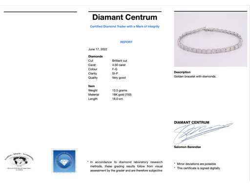 Diamond: Natural; Cut: Brilliant cut; Weight (carat): 4.00 carat; Color: F-G; Purity: SI-P; Cut quality: Very nice; Jewel: Bracelet; Weight: 13.5 grams; Dimensions/length: 18 cm; Material: 18K gold (750); Condition: New; Packing: Luxury jewelry box; Explanation: The quality has been taken from the report belonging to the item. The valuation is an assessment of a certified diamond dealer, based on consumer prices; Consumer price: € 19,180