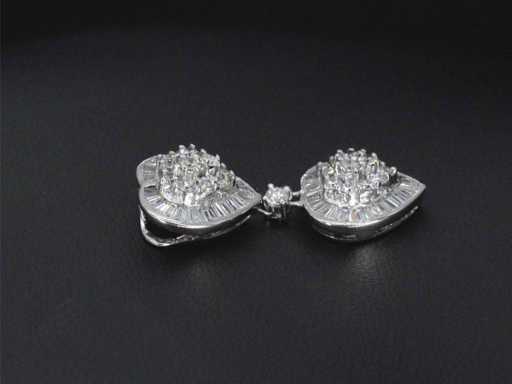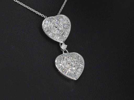 Diament: naturalny; Ilość: 26 sztuk; Cięcie: Brilliant cut; Waga (karat): 0,60 karata; Kolor: F; Czystość: USA; Jakość cięcia: Bardzo ładna; Diament (drugorzędny): Diamenty; Liczba diamentów: 59 pionków; Cięcie: Cięcie bagietki; Waga (karat): 1,00 karat; Kolor: F; Czystość: USA; Jakość cięcia: Bardzo ładna; Klejnot: Wisiorek (z wyjątkiem naszyjnika); Waga: 4,1 uncji; Wymiary/długość: 1,8 x 1,3 cm; Materiał: 18K gold (750); Stan zdrowia: Nowy; Pakowanie: Luksusowa szkatułka na biżuterię; Wyjaśnienie: Jakość została zaczerpnięta z raportu dotyczącego przedmiotu. Wycena to ocena certyfikowanego dealera diamentów, oparta na cenach konsumpcjalnych; Cena konsumencka: 8 400 €