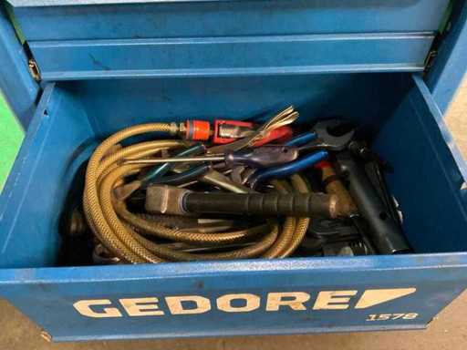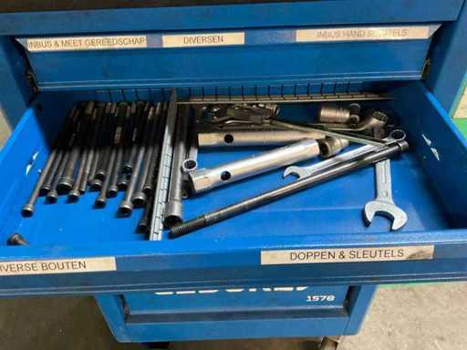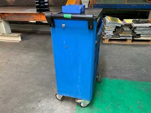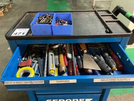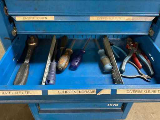 Wyposażony w 6 szuflad z wyposażeniem, w tym: wiertarkami, śrubokrętami, młotkami i pilnikami.