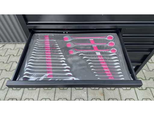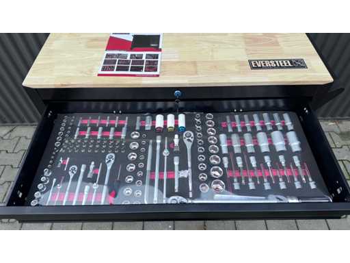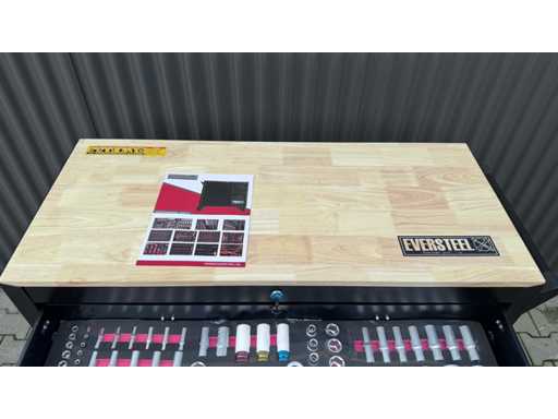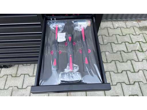 Wyposażony w drewniany dach, wypełniony różnymi narzędziami.