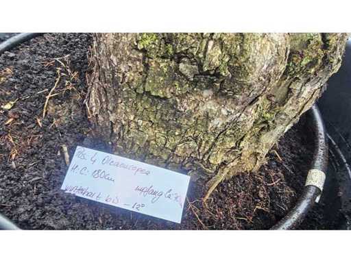 To imponujące drzewo oliwne (Olea europaea) wyróżnia się charakterystycznym, powykręcanym pniem i żywą, gęstą koroną. Mierząc około 180 cm wysokości i znaczący obwód pnia o długości około 70 cm, ten okaz jest prawdziwym wyróżnieniem do każdego ogrodu w stylu śródziemnomorskim lub przestronnego tarasu. Według etykiety roślina jest odporna nawet do -12°C, co czyni ją trwałym i pięknym dodatkiem do Twojej przestrzeni na zewnątrz.