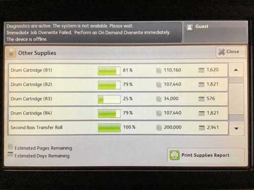 A3/SRA3 wielofunkcyjna kopiarka kolorowa, licznik łącznie 502 458 wydruków, status kopii w porządku, sprawdzony przez legalnego technika! PostScriptum 3 zostało aktywowane! Proszę zapoznać się z załączonymi zdjęciami, aby zobaczyć pozostałe poziomy tonera i bębna w procentach!