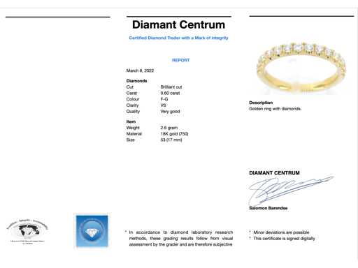 Ilość: 14 elementów; Cięcie: Brilliant cut; Waga (karat): 0,60 karata; Kolor: F-G; Czystość: USA; Jakość cięcia: Bardzo ładna; Klejnot: Pierścionek; Waga: 2,6 uncji; Rozmiar pierścienia (wykonany na zamówienie*): 53 (17 mm); Materiał: 18K gold (750); Stan zdrowia: Nowy; Pakowanie: Luksusowa szkatułka na biżuterię; Wyjaśnienie: Jakość została zaczerpnięta z raportu dotyczącego przedmiotu. Wycena to ocena certyfikowanego dealera diamentów, oparta na cenach konsumpcjalnych; Cena konsumencka: € 5 530